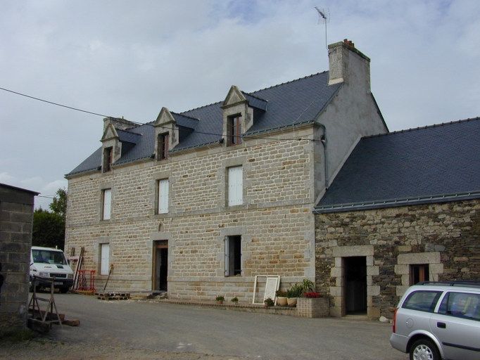 Premier logis et étable en moellon de schiste et granite, ouvertures en pierre de taille de granite, en arc sementaire pour le logis ouvert de deux fenêtres. Celui-ci est aujourd'hui couvert en ardoise. La crossette de son pignon découvert, à l'est, porte un masque sculpté. Une évacuation dans le mur de façade correspond sans doute à un évier mural. Le second logis de type ternaire avec trois lucarnes à fronton est construit en moellon régulier de granite, avec base et corniche en pierre de taille. Les niveaux sont soulignés d'un bandeau ; niche à vierge au dessus de la porte. Puits circulaire en pierre de taille de granite à margelle monolithe débordante.