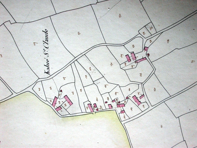 Le village de Keralué Saint-Claude s'est constitué au moins au cours du 17e siècle, au nord du chemin menant du bourg à Remungol. Comme sur le plan cadastral de 1829, il est constitué de deux noyaux individualisés : une ferme au nord (montrant une tour d'escalier aujourd'hui disparue), les autres dans la partie sud longeant le chemin. Cinq fermes ont été repérées dans le village, dont une a été sélectionnée pour étude.