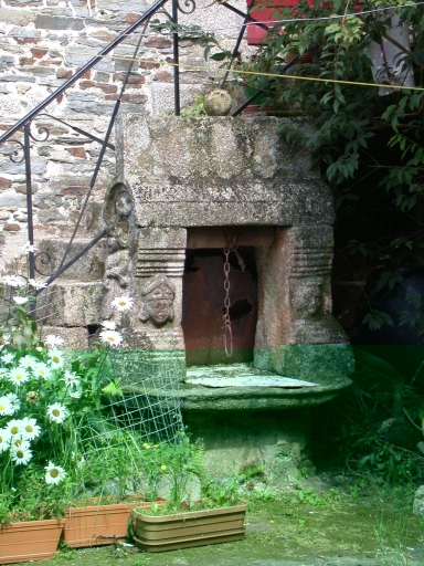 Montant du puits orné d'une silhouette de paysanne et d'une tête d'évêque.