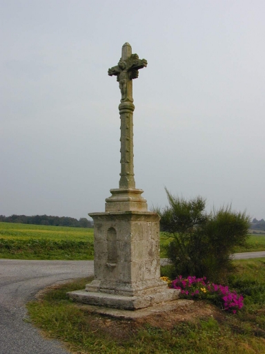 Croix sur soubassement carré en pierre de taille de granite, orné d'une niche à coquille, avec corniche en cavet. Le fut écoté orné de larmes repose sur un socle monolithe mouluré. Il est séparé du croisillon par un noeud mouluré. Le croisillon dans une gloire à bras fleuronnés est sculpté d'un Christ en croix. Sur l'avers (face nord), d'une Vierge à l'Enfant au revers.