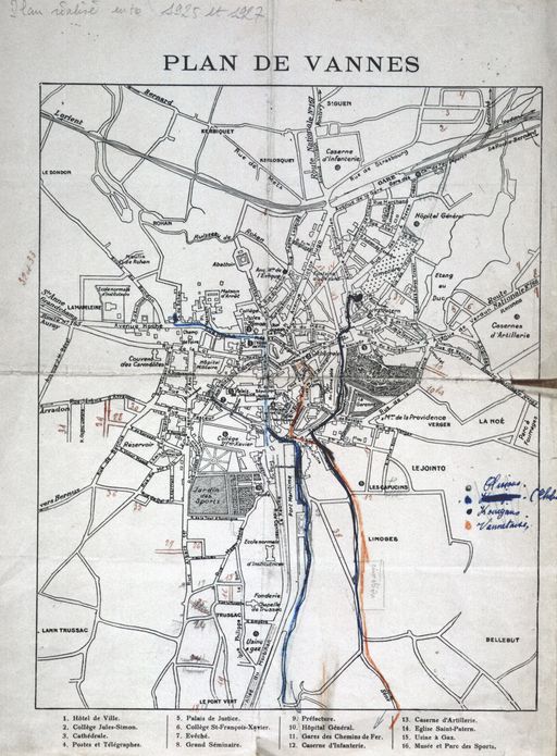 Darioritum, nom correspondant à la notion de gué, est une ville gallo-romaine créée après la victoire de César sur les Vénètes en 56 Av. J.C. Elle s'établit sur deux sites séparés par le port : la colline de Boismoreau, urbanisée entre le Ier et le IIIe siècle avec forum et basilique, et la colline du Méné, escarpée et plus facile à défendre, sur laquelle est construit à la fin du IIIe siècle, le castrum de forme triangulaire d'environ cinq hectares qui sera la base de la ville médiévale. Le château de la Motte, plus ancienne résidence du pouvoir civil et militaire (détruit), occupait le nord de l'enceinte. Au cours du Moyen-Age, la ville devenue siège d'un évêché (Saint-Patern, 1er évêque en 466) semble prospère sous la domination franque. Elle est malmenée par les normands en 919. Son histoire est ensuite liée à la Bretagne : domination des Comtes de Vannes et de Largoët, puis domaine ducal. La ville s'étend hors les murs à partir du XIII siècle vers les faubourgs du Méné, Saint-Patern, Saint-Salomon et le quartier du port. Siège de la Chambre des Comptes et des réunions des Etats de Bretagne, Vannes devient en 1379 résidence ducale jusqu'au milieu du XVe siècle : le duc Jean IV y fait construire son château de l'Hermine (détruit) et agrandit l'enceinte urbaine vers le sud. A partir du XVIe siècle, la Maison commune dotée d'un beffroi occupe l'ancienne chambre des Comptes. Au XVIIe siècle, malgré l'arrivée des congrégations religieuses à la périphérie la ville stagne et perd son rôle stratégique. Entre 1675 et 1689, l'exil du Parlement à Vannes dynamise la construction dans la rue Saint-Vincent (parlementaires) et sur le port (marchands). Axes routiers principaux, aménagement du port et plan d'embellissement dessinés au cours du XVIIIe siècle. Il en résulte l'aménagement de la place Gambetta par les architectes de la ville, Philippe Brunet-Debaines de 1834 à 1836, puis Marius Charier, après 1838. La ville décline jusqu'à l'arrivée du chemin de fer et des casernes (routes de Rennes et Pontivy) à partir de 1860 : on constate alors le transfert de l'activité économique autour de la gare, et une forte poussée constructive dans ce quartier ainsi que dans le nouveau quartier résidentiel Jeanne d'Arc-Albert Ier.