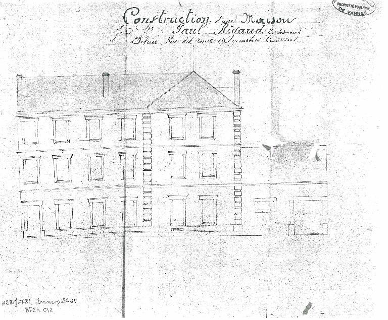 A. M. Vannes. 1 O 216 (1874-1883). Construction d'une maison pour Mr Paul Rigaud, entrepreneur, située rue des Rosiers et quartier Corvoisier, s.d., vers 1878. Comprend une élévation de l'immeuble, développée sur l'actuelle rue Jeanne d'Arc et la place Jean XXIII.