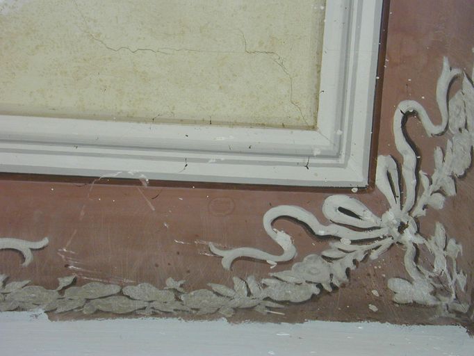 Monogramme des Tinguy et de Saint-Pierre entrelacés ornant la mosaïque de l'entrée, surmonté d'une couronne sur le balcon et le balcon. Décor de postes en bordure de la mosaïque de l'entrée, de volutes et ornement géométrique sur le balcon.