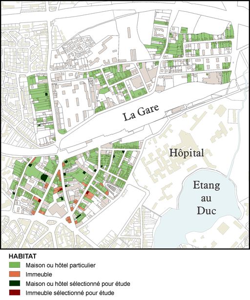 L´enquête de repérage de l´habitat du quartier de la gare a permis de recenser sur le territoire du quartier 260 maisons et seulement 23 immeubles ; ce chiffre se décompose en 153 maisons au sud de la voie ferrée, 107 au nord, les immeubles étant tous construits au sud de la voie ferrée, et principalement sur les axes majeurs, avenue Saint-Symphorien et rue Victor Hugo.