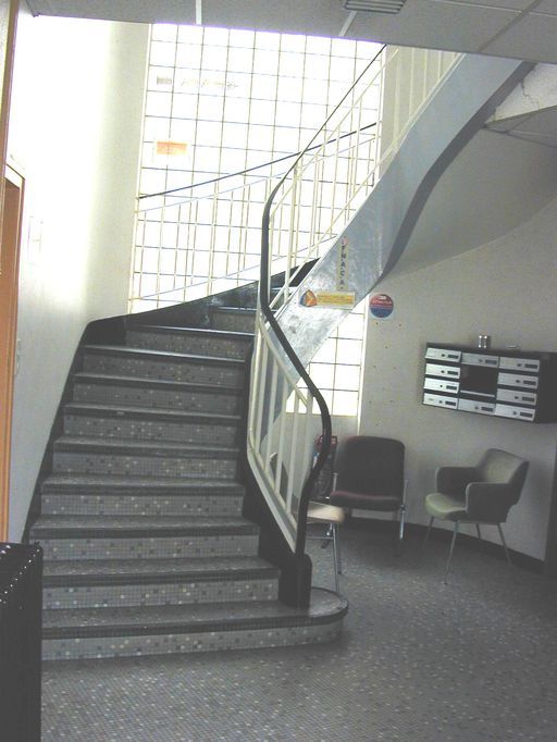 Edifice industriel à plan en équerre composé sur rue d'un immeuble à usage de bureaux à deux corps, l'un à pignon sur rue. Enduit, plan double en profondeur, un étage carré et étage de comble dans le corps à pignon sur rue ; escalier en béton tournant à retours avec jour. Entrepôt en retour sur cour en moellon enduit, transformé en bureaux avec création d'un étage carré.