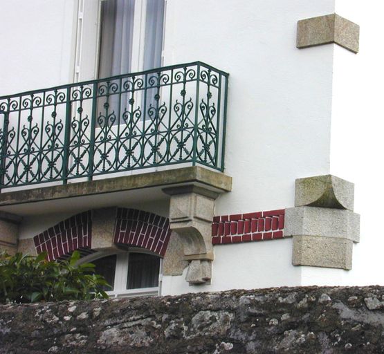 Maison soignée en retrait de la rue, à plan en L avec avancée à pignon sur rue. De nombreux détails montrent le soin apporté : perron, balcon à l'étage, ouvertures en granite et brique, traitement de l'angle antérieur droit, à pan coupé au rez-de-chaussée avec amortissement en granite, pignon en appareil polygonal avec bandeau enduit suivant les pannes du pignon débordant. Séparée de la rue par un mur de clôture, des piliers, une grille et portail en fer forgé.