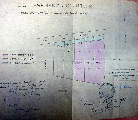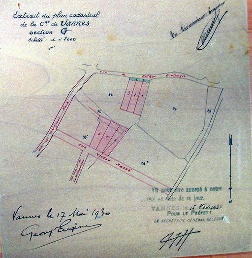 A. M. Vannes. 1O. Dossier de lotissement. Lotissement n°15. Plan masse du lotissement Eugène par Lunven, géomètre, ne figurant que les six premiers lots validés en novembre 1930.