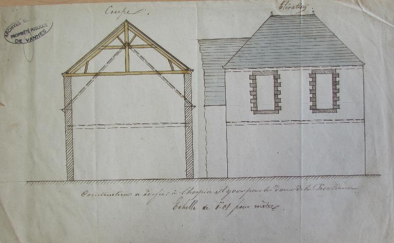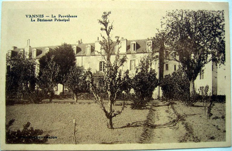 Hôpital fondé en 1698 par Marie Bérolles (veuve de Jean Bello, avocat au parlement) qui obtient de la Communauté de ville un terrain au sud de la Garenne, voisin du lieu destiné jadis à servir de cimetière aux pestiférés et non loin de sa propriété du Verger. Elle construit la chapelle placée sous le vocable Saint-Yves et le bâtiment des pauvres qui joignait la chapelle. En 1700, la fondatrice cède à la communauté de ville ce bâtiment plus deux maisons voisines avec cour, jardin et prairie ; elle rajoute des terres en 1706 et 1719. En 1705, Mgr d'Argouges confie l'hôpital aux filles de la Charité de Saint-Vincent de Paul qui quittent leur maison rue Poulho. La chapelle est bénie en 1706. L'hôpital acquiert en 1708 une autre maison avec cour et jardin qui touchait la chapelle auprès de Melle de la Chaussonnière. En 1719, construction d'un dortoir pour les soeurs et percement d'un puits à la porte de la cuisine. En 1735, construction, à l'ouest de la chapelle d'une nouvelle salle pour les hommes commandité par Mgr Fagon et d'une sacristie. Un hangar est élevé en 1744. Reconstruction du bâtiment des femmes en 1748 commandité par Mgr Bertin. La communauté de ville accorde un terrain derrière la salle des hommes pour une arrière-chambre, un terrain près de la salle des femmes pour installer un cimetière et la permission d'englober la fontaine voisine dans l'enclos. Les biens sont saisis à la Révolution et attribués à la commission des Hospices de Vannes. En 1803, l'établissement est remis à la disposition des soeurs et en 1853, l'hôpital devient la propriété de la communauté des soeurs de la Charité de Saint-Vincent de Paul. En 1868, l'établissement prend le nom de maison de la Providence, suite au transfert de cette oeuvre antérieurement rue du Nord : en 1874, les religieuses y bâtissent une vaste maison et détruisent l'ancien qui masquait la nouvelle construction (Lallemand). La chapelle est cependant conservée. Les bâtiments sont détruits en 1966 pour être remplacés par une résidence de plusieurs immeubles édifiée sur les plans de l'architecte Yves Guillou.