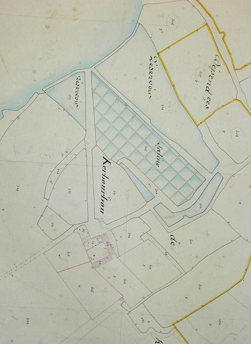 A. M. Vannes. 21 Fi. Plan cadastral 1807-1809. Tableau d'assemblage de la commune et plan par sections. Delavau (ingénieur) ; Dreuslin (géomètre). Plan aquarellé, 99,5 x 67,41 cm.