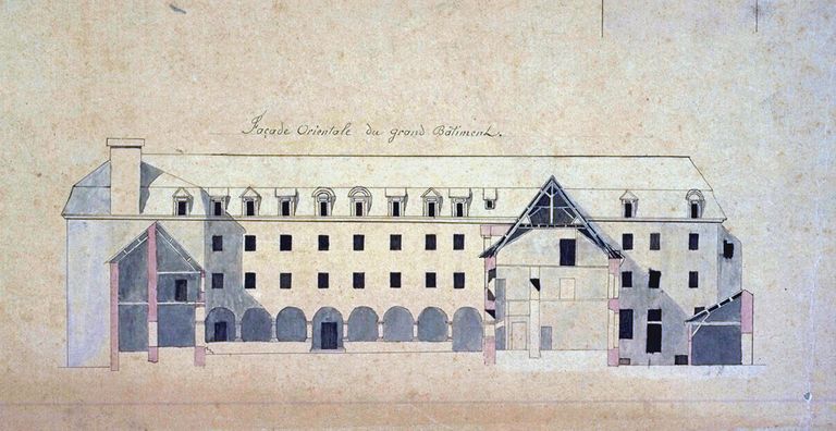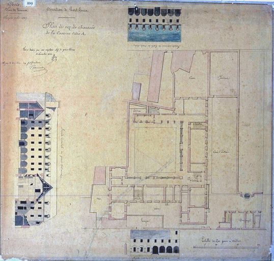 A. D. Morbihan. 1 Fi 100. Fonds du Génie. Place de vannes. Direction de Port-Loyuis ; projet pour 1825. Plan de la caserne (plan, coupes, élévations). Dessin : plan par Jary, capitaine du Génie à Vannes, 20-11-1824. Ech. 1 cm. pour 2 m., papier collé sur carton, plume encre de chine, lavis couleur.