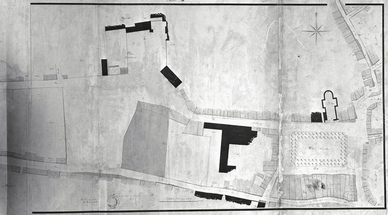 A. M. Vannes. 21 Fi. Plan cadastral 1807-1809. Tableau d'assemblage de la commune et plan par sections. Delavau (ingénieur) ; Dreuslin (géomètre). Plan aquarellé, 99,5 x 67,41 cm.
