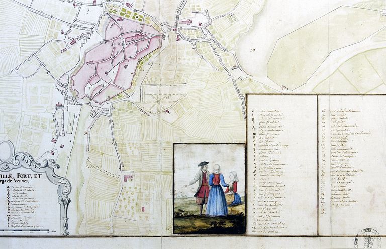 A. M. Vannes. 21 Fi. Plan cadastral 1807-1809. Tableau d'assemblage de la commune et plan par sections. Delavau (ingénieur) ; Dreuslin (géomètre). Plan aquarellé, 99,5 x 67,41 cm.