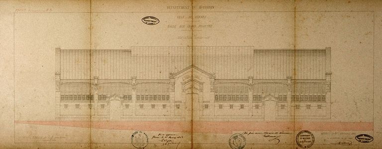 A. M. Vannes/19,1/Ville de Vannes. Halle aux grains. Projet A. N°2. Elévation sur la place et coupe. Dessin : élévation, coupe par Marius Charier (architecte de la ville), 31 décembre 1861. Ech. 1 : 100, papier entoilé, plume encre de chine ; lavis couleur, 83,1 Lx31,6 l. A.M. Vannes/19,2/Ville de Vannes. Halle aux grains. Projet A. N°3. Elévation latérale sud. Dessin : élévation, par Marius Charier (architecte de la ville), 31 décembre 1861. Ech. 1 : 100, papier entoilé, plume encre de chine, lavis couleur, 83,2 Lx31,5 l. 1.
