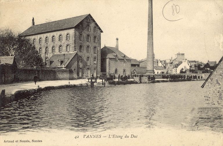 A l'origine, le moulin au Duc est un moulin banal dépendant du duc de Bretagne. Il est construit à la suite d'un échange des ducs de leur moulin de Bohalgo, échange qui aboutit au creusement de l'étang au Duc pour alimenter le moulin. Propriété de la Couronne après la réunion de la Bretagne à la France, il est vendu en 1697 à Renouard de Villayer. Ce dernier revend le moulin à la ville en 1756. Vendu comme bien révolutionnaire à Perrine Corvec et à Mr Caradec le 13 juin 1793, il est exploité par cette famille jusqu'au rachat par les frères Boterf. Ceux-ci le transforme en minoterie : le moulin est reconstruit en 1878-1879. Le nouveau bâtiment de la minoterie dit minoterie Sainte-Anne est bénie par Mgr Bécel le 18 avril 1882. Le règlement d'eau établi en 1811 est repris en 1882. Le moulin et la minoterie sont ensuite vendus aux frères Dalido qui les équipent de "plansichters" modernes (blutoir mécanique). L'installation, assurée par des techniciens alsaciens, contribue à faire du "Moulin au Duc" l'un des plus performants de l'ouest. En 1929, il devient la "Compagnie Agricole du Morbihan" et cesse son activité en 1962. Il est détruit en 1974. La statue de sainte Anne qui ornait le pignon sud de la minoterie est descendue la même année et transportée au rond-point de Saint-Léonard en direction de Theix.