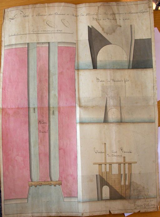 A. D. Ille-et-Vilaine. Série C. C 704/12/ Fonds de l'Intendance. Plan géométrique et détaillé du moulin au duc et de ses environs avec un profil de la partie du canal à l'endroit du pont ou arche neuve construite par Le Haaz. Dessin : plan géométral par Anfray (ingénieur), Le Roy (?), David (?), 1768. Ech. 1 : 72, papier, plume encre de chine, plume encre de couleur, 178 Lx61 l. C 704/13/ Fonds de l'Intendance. Plan, élévation et coupe d'une nouvelle arche dans la chaussée de l'étang du Duc, à l'endroit de la coursière des moulins, proposée pour avoir lieu au cas qu'il ne soit pas possible de réparer l'ancien, comme nous l'avons expliqué au procès-verbal. Dessin : plan, élévation, coupe pour Gaspard-Louis Caze, baron de la Bove (intendant de Bretagne), 1783 (?). Ech. 1 : 56, papier, plume encre de chine, lavis encre de chine, lavis couleur, 66 Lx36 l.