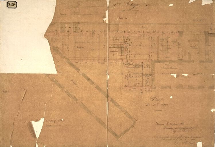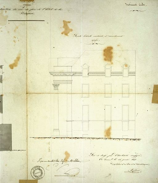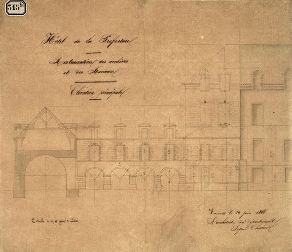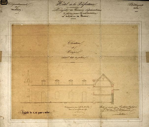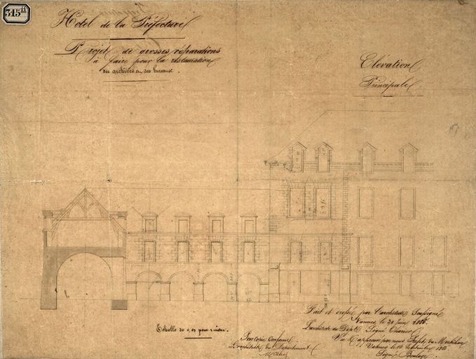 A. D. Morbihan 1Fi 315/1 à 11. 1853-1855. Construction du mur de face de l'hôtel de préfecture : plans, coupes, élévations par Charier ; projet de réparations à faire pour la restauration des archives de la préfecture par Charier.