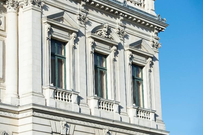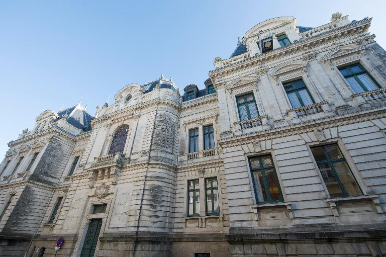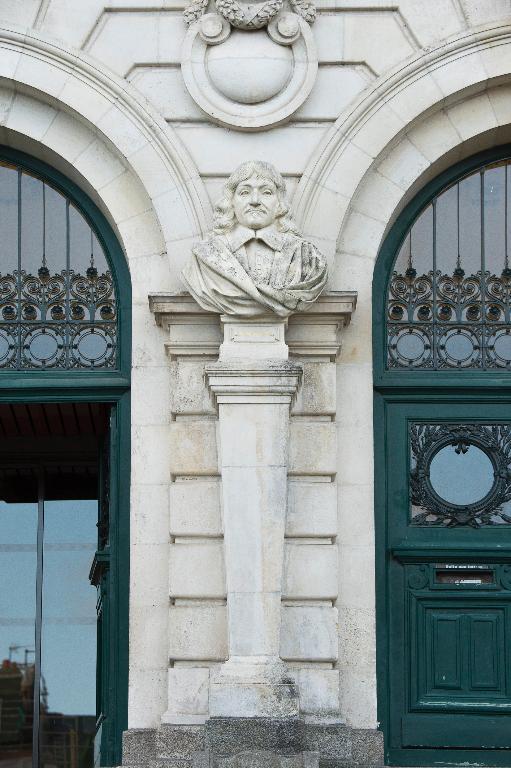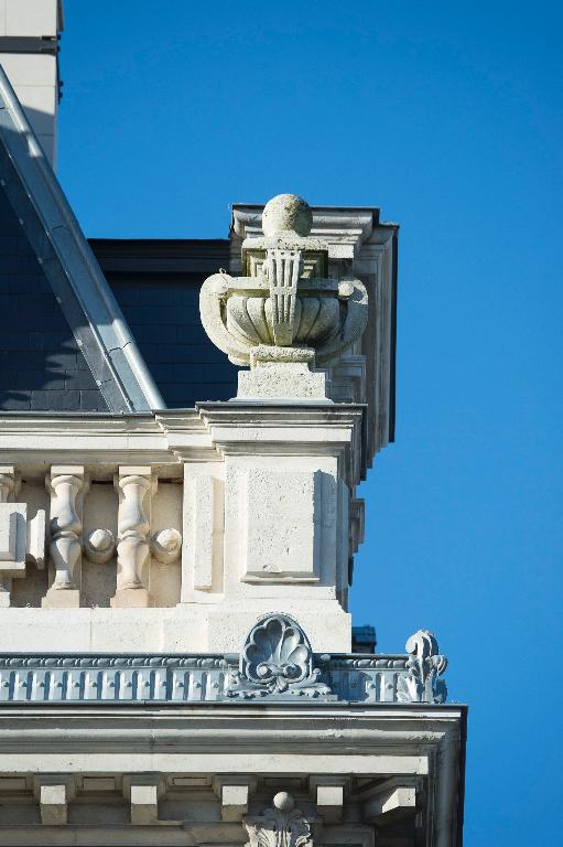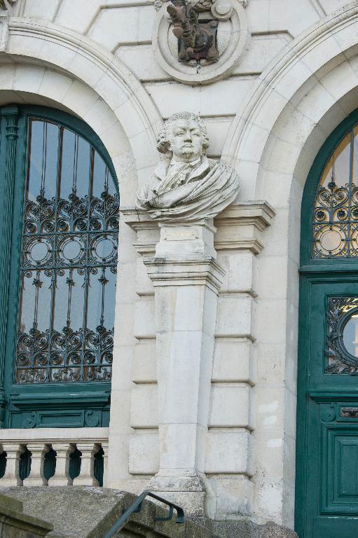 La verrière du grand escalier représente le mariage d'Anne de Bretagne et de Charles VIII célébré à Langeais en 1491 ; il est éclairé par une verrière aux armes de la ville. La salle des fêtes montre une profusion de décor : palmes, chutes de fleurs, volutes, masques, trompettes et des médaillons de têtes féminines allégories de la science, marine, commerce, agriculture, industrie, arts ; les voutes de la salle des fêtes montrent un décor de mosaïque dorée peinte en trompe l'œil, oeuvre de l'atelier Felz-Landigeois. En extérieur, le haut des marches de l'escalier du corps central montre des bustes posés sur des piédestaux et adossés au bossage de Thiers, Lesage, Mirabeau et Descartes.