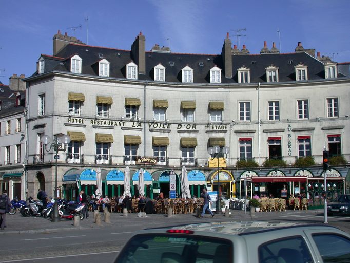 Immeuble d'angle mitoyen avec une élévation principale courbe à 6 travées et une travée droite en retour. L'élévation principale donnant sur la place est à arcades ouvrant sur des boutiques au rez-de-chaussée. La maçonnerie est en granit enduit peint en blanc et faux appareil mais les arcades et le rez-de-chaussée sont en pierre de taille. L'élévation de la façade en retour est identique à la précédente. La façade postérieure au nord est en pan de bois. Bandeaux et corniches des ouvertures sont en calcaire. Présence de balcons en fer forgé aux fenêtres du 1er étage. Le rez-de-chaussée très remanié empêche toute lecture intérieure.