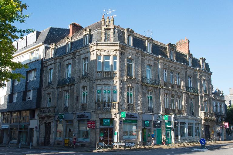 En pendant de l'immeuble de la Poste qui occupait l'angle sud-est de la place, cet immeuble fait preuve de grande qualité avec le traitement du pan coupé, de la travée des portes d'entrée rue Thiers et place de la République et des trois travées médianes sur la place de la République en pierre de taille de granite.