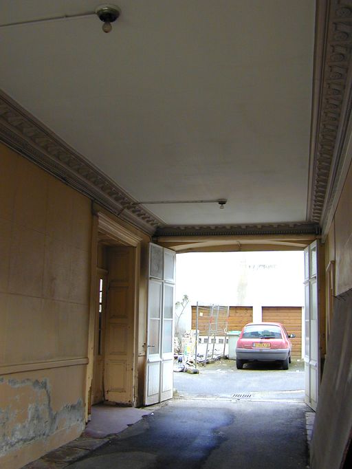 Immeuble établi sur une parcelle large à plan double en profondeur. Aujourd'hui en moellon de granite désenduit, avec corniche en calcaire, il possède deux étages carrés desservis par un escalier latéral postérieur à retours avec jour en charpente. Le passage couvert médian donne accès à cet escalier et à la cour postérieure. Un corps de communs en moellon enduit à un étage carré occupe le nord de la cour ; son rez-de-chaussée est constitué d'une série d'ouvertures en plein-cintre. Les dépendances à l'est ont un comble à surcroît.
