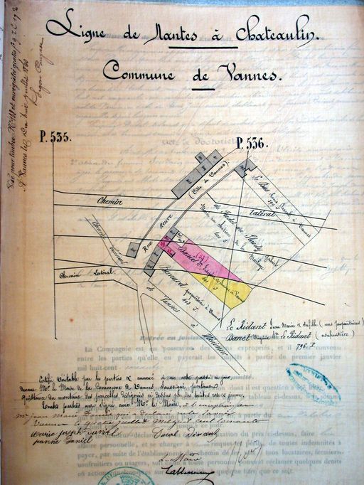 A. D. Morbihan. S 328. Ligne de Nantes à Châteaulin. Affaires diverses. 1860 Chemins de fer de Bretagne. Carte de l'ancienne province de Bretagne sur laquelle on a figuré les tracés des divers chemins de fer du réseau breton étudiés conformément au programme du 11 mai 1853. Signé de l'ingénieur en chef du Morbihan, attaché aux études des chemins de fer de Bretagne. H . Jacquemet. Vannes le 8 Août 1854. Compagnie du chemin de fer de Paris à Orléans. Travaux neufs. Réseau de l'ouest. Ligne de Nantes à Châteaulin, partie comprise entre Savenay et Lorient, sur une longueur de 150km. Plans et profils généraux (sans date) . 21 juin 1860. Compagnie du chemin de fer d'Orléans. Chemin de fer de Nantes à Châteaulin. Construction du chemin entre Vannes et Quimperlé sur une longueur de 74, 300 km. Plans itinéraire avec nivellement en long indiquant l'emplacement des stations projetées. 12 mai 1860. Compagnie du chemin de fer de Paris à Orléans. Ligne de Nantes à Châteaulin. Etablissement des stations. 25 mai 1860. Enquête relative aux 4 stations pour le chemin de fer de Nantes à Châteaulin. Approbations ou remarques des conseils municipaux des communes traversées. Stations de Malansac (2020 hab.), Questembert, (3844 hab.), Elven (3467 hab.), Vannes (12466 hab.), 4 juin 1860. Ministère du commerce de l'industrie et des travaux publics. Direction générale des Ponts-et-Chaussées. Chemin de fer. Division des études et travaux. Ligne de Nantes à Châteaulin. Projet de traversée des routes impériales et départementales.