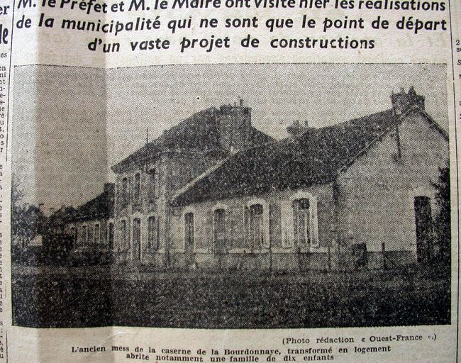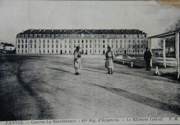 La caserne de la Bourdonnaye a été édifiée en 1881 (selon Leguay) ou en 1883 (selon André) ; son auteur reste encore inconnu. Elle voit le jour après la construction des deux casernes d'artillerie qui s'effectuent entre 1875 et 1881 sur la route de Rennes. Pendant la guerre, la caserne sert de dépôts de matériels. Elle est incendiée en 1944 lors du départ des allemands. La caserne est rachetée par la ville (26 septembre 1949) et transférée à l'OPCHLM qui en fait sa première opération concrète. La première réalisation concerne la transformation de l'ancienne infirmerie en logements, suivant les plans de Yves Guillou, datés de 1950 : pour ce faire, l'architecte surélève le bâtiment d'un étage et remanie la structure intérieure. La seconde opération, projet conjoint des architectes vannetais Yves Guillou, Robert Lamourec et Edmond Gemain voit la construction de 128 logements édifiés à la place des anciens bâtiments militaires. La caserne est implantée initialement hors du périmètre de l'octroi mais sera plus tard intégrée à ce périmètre. Parallèllement, la ville achète le 30 avril 1951 le chemin de ronde qui entourait la caserne, à l'exception du hangar (au nord) et du terrain vendu à la coopérative agricole. Plusieurs vestiges ont été conservés : le premier est le bâtiment de l'infirmerie transformée en logements, le second est le mess, situé au nord de la caserne, et enfin les deux pavillons d'entrée sur l'avenue Wilson, privatisés et transformés en commerce. Enfin, plusieurs bâtiments, dont le hangar mentionnés dans l'acte de cession à la ville du chemin de ronde en 1951, conservés à l'extérieur du périmètre de la caserne semblent avoir un rapport de fonctionnement avec cette dernière..