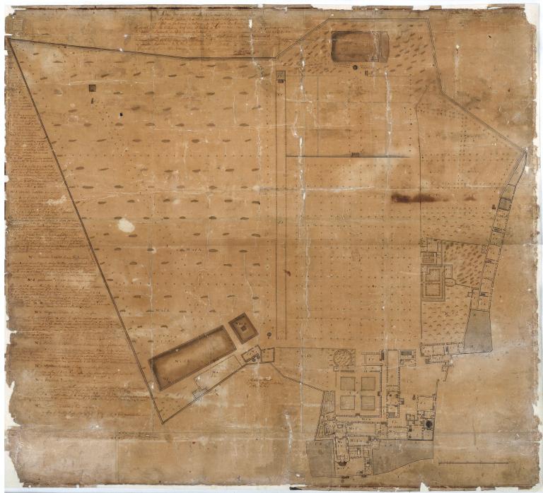 Le petit jardin de l'orangerie contenant une petite orangerie deux petits cabinets à fruit dont l'un donnant au levant sur le friche affecté à la cinquième division, les ouvertures et communications donnant sur la dite division seront condamnées le dit jardin donnant du nord sur le pré aux oies, du midy au mur faisant le débordement nord du jardin de la seconde division, du levant par mur de friche affecté à la cinquième division, de l'ouest par le petit parterre. Le petit parterre contenant une loge à serrer les outils du jardinage, une loge à cochons avec sa petite cour pavée, deux auges de pierre dans la cour, une loge à charrettes avec un petit vague au couchant à la dite loge le tout borné au nord par le pré aux oies, au midy par le mur servant de débornement nord au jardin affecté à la seconde division au levant par le petit jardin de l'orangerie et au couchant par mur donnant sur le jardin affecté à la neuvième division prolongé à la haye d'épines servant de débornement nord au jardin affecté à la seconde division jusqu'au jalon numéroté I le tout contenant sous fond trente cordes quatre vingt treize pièds environ.