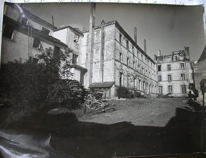 Une cour avec un puits au midy de la dite maison, bornée au nord partie par la dite maison et partie par celle dite des garçons au midy par le premier corps de logis désigné dans la seconde division au levant par la petite aile contenant la pharmacie faisant partie de la première division et au couchant par le mur que l'adjudicataire de la présente division sera tenu d'élever partant du coin de la maison dite des classes comme il est dit dans l'article de la seconde division la dite cour contenant environ trois cordes sous fond.