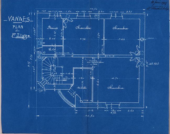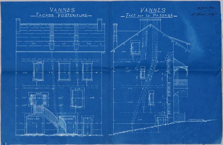 Maison construite dans le 2e quart du 20e siècle pour et par l'entrepreneur Huchet sur des plans dressés en 1925 avec garages contemporains dans la cour au nord.