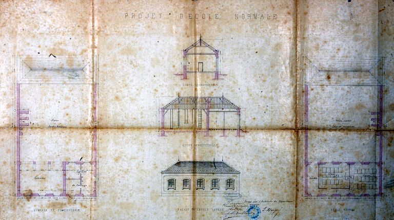 En alignement sur la route, quatre pavillons en rez-de-chaussée regroupés par deux et séparés entre eux par une courette abritent d´un côté le gymnase et le logement du concierge, de l´autre l´école d´application. Le vaste terrain clos de murs ménagé au nord était cultivé.