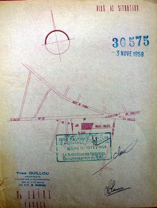 A. D. Morbihan. S 247. Alignements Vannes. RN 165. 1901-1920. 10 juillet 1903. Demande de Francis Huchet entrepreneur à Vannes, rue Saint-Symphorien pour un alignement concernant un mur de clôture surmonté d´une grille et porte cochère pour accéder à la propriété de M. Marcotte, propriétaire 13 rue Pasteur. Francis Huchet fera une nouvelle demande pour ouvrir une porte piétonne dans le mur de clôture le 8 mars 1907 (plan non photographié).