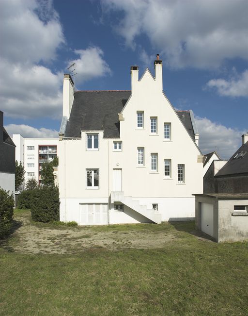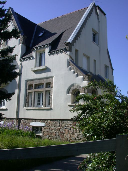 Grande maison isolée construite en retrait de la rue avec jardin environnant clos de murs. La maison, double en profondeur est de plan massé avec rez-de-chaussée surélevé bâti sur sous-sol. La façade sur rue se présente avec une entrée d'angle située à gauche et sous porche dans -oeuvre, un bow-window surmonté d'une fenêtre pignon et un appentis latéral droit contenant peut-être la cuisine. Les encadrements des baies en granite, matériau que l'on retrouve également apparent sur les arêtes des toits confèrent à la maison un type régionaliste. Au soubassement traité en moellons apparents succède un enduit épais. L'escalier est latéral postérieur, éclairé par 2 étages de 3 jours décalés.
