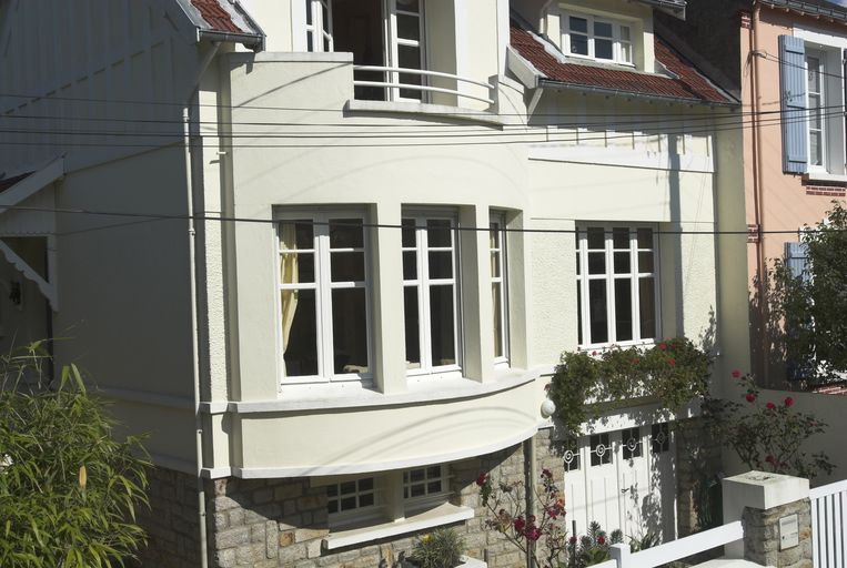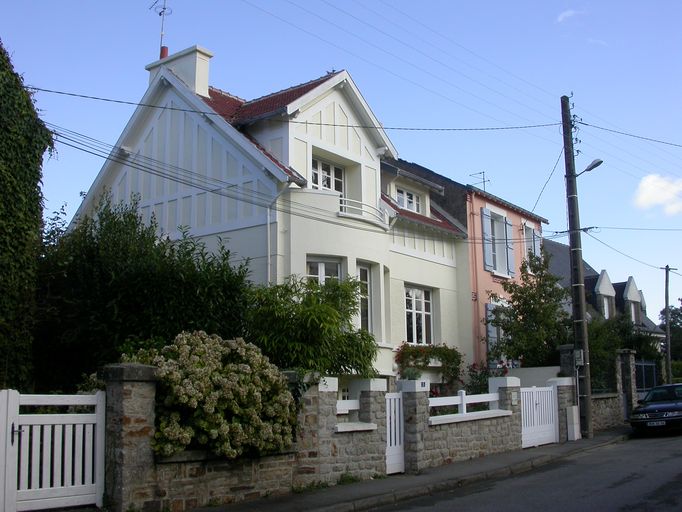 Typologiesen retrait ; jardin environnant ; maison à plan massé ; style régionaliste ; bow-window