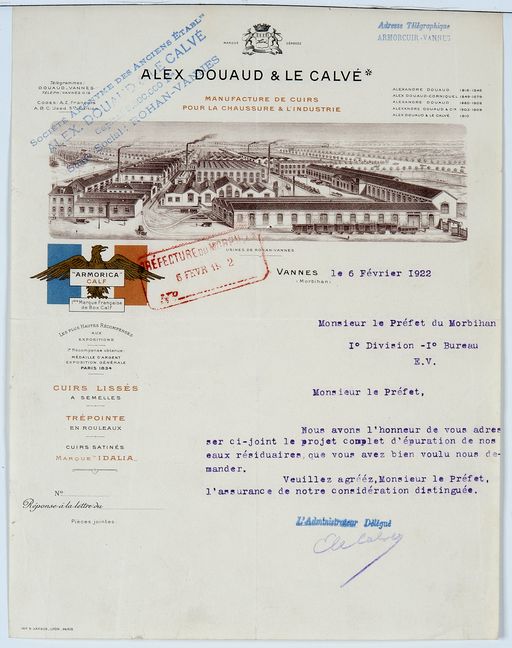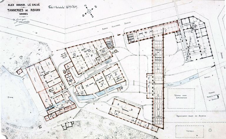 La tannerie construite par Alexandre Douaud en 1880 subit des modifications notables au début du 20e siècle. Tout d´abord, en 1903, Alexandre Douaud sollicite la permission de recouvrir une partie du ruisseau ; l´autorisation lui en est donné le 16 mai. Suite à l´incendie de l´ancien moulin et des bâtiments adjacents en 1911, des agrandissements importants, sont exécutés sans demande d´autorisation en 1912-1913. Ils sont complétés par le projet d´un bâtiment d´administration dessiné par l´architecte Caubert en 1922, situé à l´angle des rues de Rohan et Douaud (actuelle voir Georges Pompidou). Cependant ce projet de bureaux ne semble pas avoir été réalisé : il ne figure pas sur le plan de la reconstruction de 1947. La société est alors florissante, est dotée d´un outillage moderne et emploie 200 personnes. Dès 1926 cependant, « l´entreprise chôme deux jours par semaine et prévoit un chômage plus important » (Bernard André, in : Histoire de Vannes). Les difficultés de l´entreprise amène Douaud à vendre sa maison située au dessus de l´usine, au docteur Caudrelier qui y installe sa clinique du Sacré-Coeur.