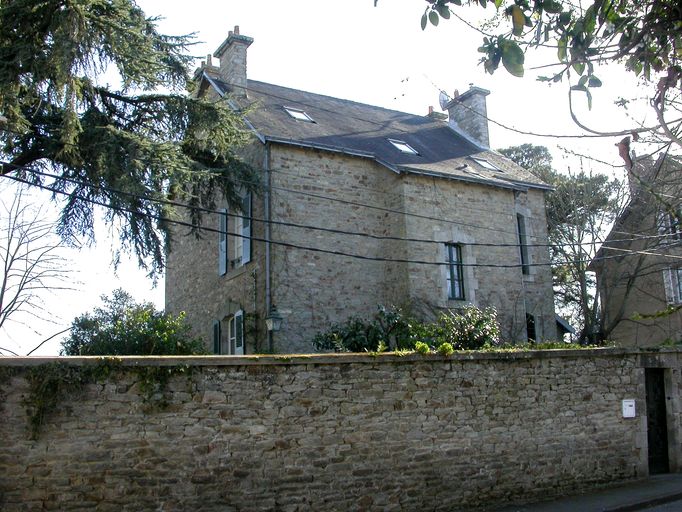 Maison isolée importante établie en retrait de la rue et orientée par rapport au grand jardin environnant clos de murs. De plan massé, elle comprend une petite avancée centrale en façade nord comprenant l'escalier et l'entrée principale. Double en profondeur, elle montre une élévation désenduite d'un étage carré et d'un étage de comble avec pierre de granite pour les encadrements de fenêtres. Le corps hors-oeuvre pignon ouest en appentis et couvert en tuile est une entrée secondaire à la maison avec pièces de service. Sous-sol non vu mais supposé.