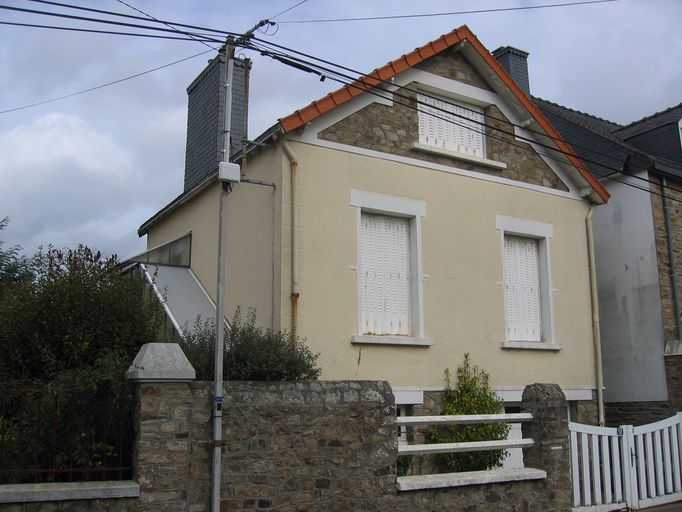 Maison construite en retrait de la rue avec jardin postérieur clos de murs. Maison de plan massé à pignon sur rue et double en profondeur, elle présente un rez-de-chaussée surélevé sur sous-sol comprenant un garage et un étage de comble. L'accès au bâti est en façade latérale avec escalier parallèle. La maison montre une élévation à travées enduite de type tyrolien (crépi moucheté) sur un soubassement en moellons apparents repris au niveau supérieur du pignon. Les linteaux et appuis des baies, le bandeau d'étage en ciment, le faux chaînage d'angle enduit donnent à la façade un décor de matière.