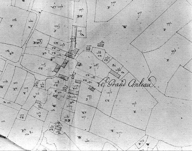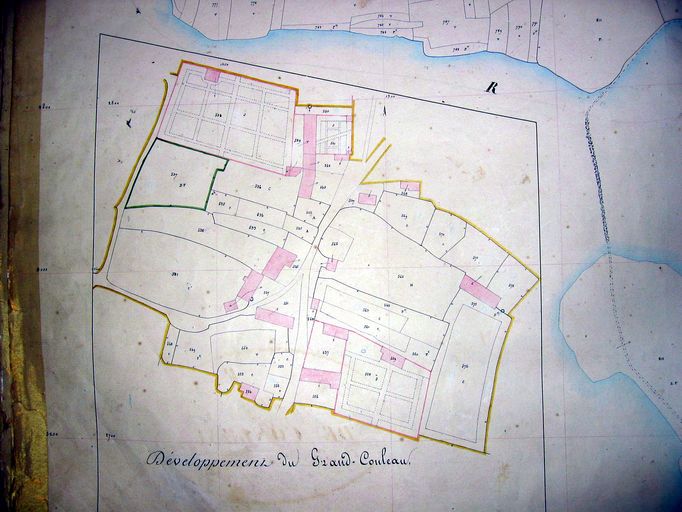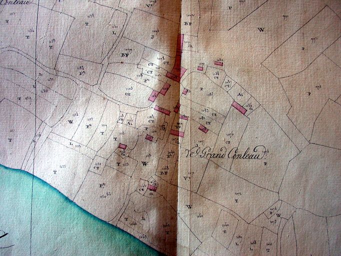 A. M. Vannes. 21 Fi. Plan cadastral 1807-1809. Tableau d'assemblage de la commune et plan par sections. Delavau (ingénieur) ; Dreuslin (géomètre). Plan aquarellé, 99,5 x 67,41 cm.