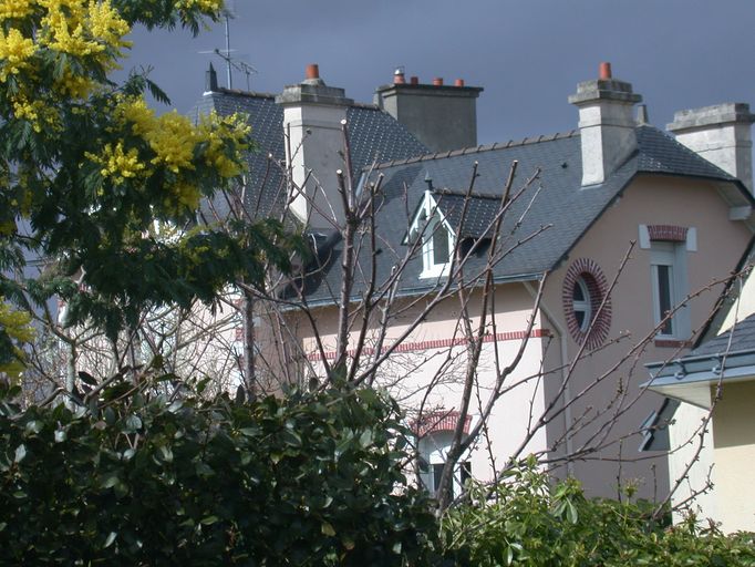 Belle maison avec des aspects de villégiature : brique, fermette débordante, oculus. La maison a été partiellement vue.