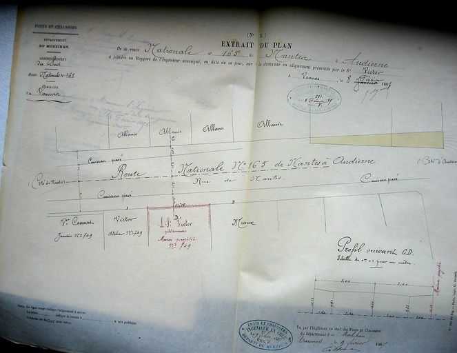 A. D. Morbihan. S 246. Alignements Vannes. RN 165. 1881-1900. 8 janvier 1885. Demande de M. Labaraudrie pour M. Victor entrepreneur de serrurerie, pour construire une maison sur la RN 165, rue de Nantes. Peut-être non réalisé. Plan. Demande pour construire un atelier, le 16 avril 1886, plan. 4 janvier 1887. Demande de M. Victor entrepreneur de serrurerie, pour construire une maison sur la RN 165, rue de Nantes, traverse de Vannes, n° 749 : emplacement et élévation.