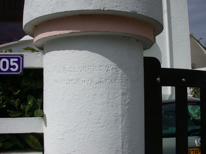 Maison semi-mitoyenne construite en retrait de la rue et séparée de celle-ci par un très bel enclos dans le style de la maison. Le jardin est en fond de parcelle. C'est une maison double en profondeur de plan allongé. Elle montre une élévation ordonnancée à 3 travées enduites. Elle est en rez-de-chaussée surélevé sur garage sous une toiture terrasse. Un escalier extérieur tournant avec rampe d'appui pleine permet l'accès à la partie habitation à partir de la cour. Le sommet de la façade est couronné par des éléments décoratifs 1930 formant clôture.