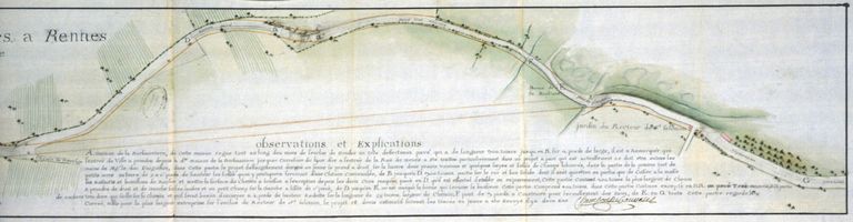 A. D. Ille et Vilaine. Série C. C 704/22/ Fonds de l'Intendance. Plan de la banlieue de la route de Vannes à Rennes avec ses projets de travaux pour la rendre praticable. Dessin : plan géométral par Chambon de Beauvalet (ingénieur des Ponts-et-Chaussées), milieu 18e siècle. Ech. 1 : 1720, papier, plume, encre, aquarelle, 143 Lx24 l. C 704/23/Fonds de l'Intendance. Plan de la banlieue de la route de Vannes à Rennes avec ses projets de travaux pour la rendre praticable. Dessin : plan géométral par Chambon de Beauvalet (ingénieur des Ponts-et-Chaussées), milieu 18e siècle. Ech. 1 : 1720, papier, plume, encre, aquarelle, 145 Lx24 l.