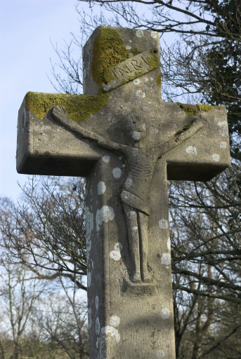 Christ en croix sur la face antérieure (sud). Calice, ostensoir, coeur Vendéen superposés sur la face postérieure (nord).