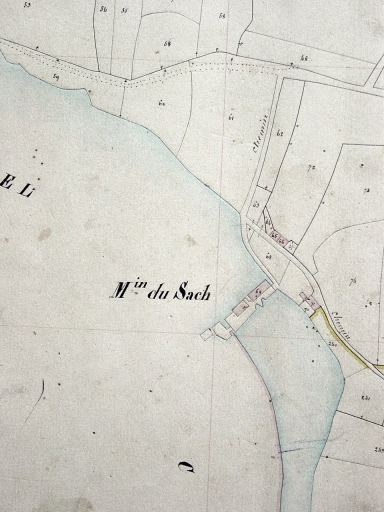 L´origine des moulins à marée de Belz est mal connue. Ceux de Kerlutu (moulin des Oies) et du Sac´h sont cités dans les déclarations du 17e siècle. La seigneurie du Sach et hameau du même nom se trouvent en Etel, ancienne commune et paroisse d´Erdeven. Celui du Bignac est construit vers 1856 par M Paissel, qui acquiert le bras de mer pour le transformer en étang (fig. 3). Les moulins à vent de Kercadoret, de Mané-er-Lann et de Keryargon sont également nommés dans les archives du 17e siècle. Ils fonctionnent encore vers le milieu du 19e siècle, comme l´indique le plan cadastral de 1845. Celui du Bignac date de la seconde moitié 19e siècle, probablement contemporain du moulin à marée autorisé en 1856. Ceux des environs de Kernours ne sont reconnus que par le seul plan cadastral.