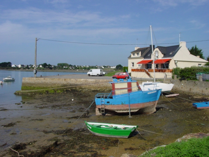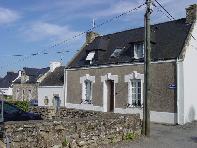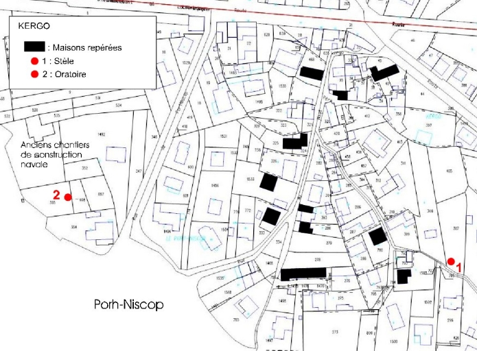 Kergo est situé sur un promontoire côtier dominant la rivière d'Etel, dont les pentes s'infléchissent au sud vers l'anse de Porh-Niscop. L'urbanisme s'est développé à partir du hameau ancien. Ainsi les limites nord de l'écart sont constituées par les parcelles dominant topographiquement la RD 781 et sa jonction avec la RD 9. Seules deux maisons situées anciennement en contrebas, aujourd'hui impasse de Kergo, sont incluses dans l'écart (fig. 7). Au sud-ouest, des constructions récentes rejoignent désormais le rivage et Porh-Niscop. Le port d'échouage de Porh-Niscop présente de simples infrastructures : côté nord, un terre-plain aménagé de quais et d'une cale abritée (fig.4), et au sud, un quai avec également cale de mise à l'eau. Ces ouvrages sont en pierre de taille. Dans le fond de l'anse des enrochements récents accompagnés de remblais ont comblé une partie du rivage naturel. Au nord, à proximité de l'oratoire Notre-Dame (non repéré) subsistent les hangars d'un ancien chantier de construction navale (non repéré), avec cale de mise à l'eau. L'habitat repéré est en majorité constitué de maisons de pêcheurs. 14 maisons sont repérées parmi lesquelles on trouve 6 maisons à pièce unique sous comble à surcroît (AH 36, 324-325, 393, 280, 1468). Dans cette première catégorie on retiendra des maisons couvertes d'un toit à un seul pan semblables à des annexes mais dont la tradition orale confirme qu'il s'agissait de logement pour une famille (fig.16). Le n°8 rue du Haut-Kergo est constitué de deux maisons jumelles à pièce unique (fig.11). Les maisons à deux pièces symétriques sous comble à surcroît, repérées, sont au nombre de 5 (AH 40, 468, 780, 794, 16). Le n°1 impasse Le Bideau, bien que remanié de lucarnes à la capucine est un intéressant exemple de ce type, datant du début du 20e siècle. Par ailleurs elle confirme une organisation spatiale caractéristique des villages de pêcheurs : La maison perpendiculaire à la voie principale présente une servitude de passage devant sa façade, avec jardin au sud. L'annexe à gauche servait d'écurie à une ou deux vaches (fig.12).