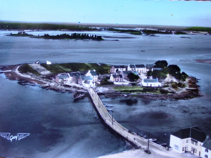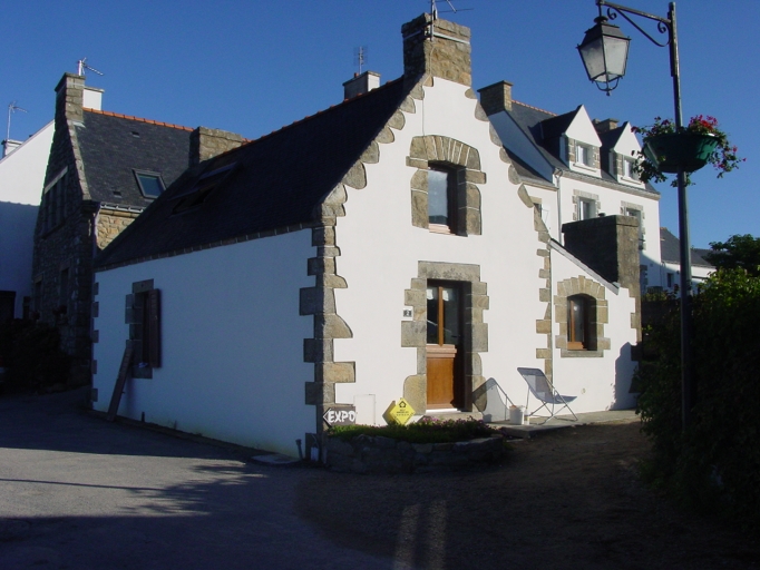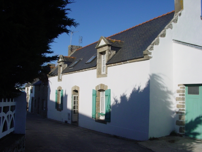 Seule la moitié sud de l'île est urbanisée. Les maisons s'organisent autour du placitre de l'église et son calvaire (étudiés) et le long des deux ruelles qui y aboutissent. A compter de la fin des années 1960 des constructions neuves se sont implantées à l'arrière ou au devant des parcelles déjà construites, certaines avec des formes bien étrangères aux maisons de pêcheurs qui constituent l´habitat traditionnel sur l´île. 8 maisons sont repérées : 1 maison à pièce unique sous comble à surcroît (AC 152), 2 maisons à 2 pièces symétriques sous comble à surcroît (AC 995 et 890, 154), 3 maisons à étage, comble à surcroît, à 1 ou 2 travées (AC 197, 196, 905), 2 maisons à étage et façade de type ternaire (AC 155, 1095-1096). Parmi les maisons à 2 pièces on notera que le n°7 rue du calvaire réuni deux logis sous un même toit (fig.13). Quant à l´ancien presbytère construit entre 1815 et 1845 (date portée illisible), il fut également transformé en maison à logis multiple. Quatre familles y logeaient au début du 20e siècle, ce qui explique la transformation des deux fenêtres du rez-de-chaussée en portes (fig.16).