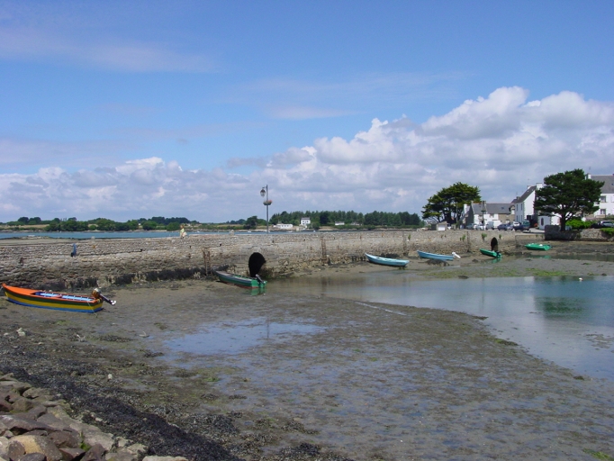 La légende attribue la construction d'un pont entre l'îlot et la terre ferme, à saint Cado lui-même, au 6e siècle. Les digues de ce type, construites sous l'Ancien Régime sont difficiles à dater. Celle de Saint-Cado présente de nombreuses reprises de maçonnerie. Cependant, la dimension des pierres de taille aux abords des deux arches et l'appareillage assez frustre de celles qui en constituent les voûtes, laissent à penser qu'elles datent du 17e siècle voire de la fin du Moyen Âge. Toutefois, la description qu'en donne Dubuisson-Aubenay, en 1636, est celle d'une digue percée en deux endroits pour l'écoulement des marées, ces deux percements étant simplement couvert d'un platelage de bois (annexe 1). Les parapets sont de l'époque contemporaine.