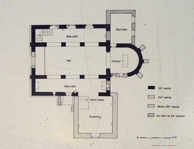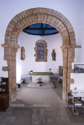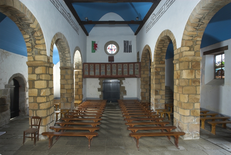 L'édifice primitif est de plan rectangulaire avec nef à trois travées, flanquée de deux bas côtés que séparent des arcades en plein cintre reposant sur quatre piliers ornés de simples larmiers ou tailloirs. L´abside du choeur est cantonnée à l'extérieur de minces contreforts. De part et d'autre dans le prolongement des bas-côtés, on devine la présence initiale d'absidioles dont il ne subsiste que les arcs des ouvertures (bouchées). Il subsiste également de cette première période trois ouvertures d'origine : deux petites fenêtres à larges ébrasements intérieurs, une dans le bas côté sud, une dans le choeur, et, jouxtant cette dernière, une baie axiale qui dans des proportions plus importante est soulignée à l'intérieur par un large tore sculpté. La crédence ou sacraire de l´abside du choeur à traverse et accolade est postérieure. Plus significative encore est l'arcade à double rouleau qui ouvre la nef sur le choeur. Elle repose sur des colonnes engagées coiffées de chapiteaux sculptés de motifs géométriques ou d'inspiration végétale telles ces volutes symétriques évoquant le calice d'une fleur. Leurs astragales sont moulurés de deux tores. Au cours des travaux de restauration de l'édifice en 1960, des colonnettes à chapiteaux romans prismatiques ont été observées noyées dans la maçonnerie de la partie haute du pignon orientale. Il s'agit sans doute des vestiges du clocheton roman ouvert de petites arcades à claire voie. L'une de ces colonnettes est toujours visible dans le parement extérieur du pignon oriental au-dessus de l'abside. La façade occidentale épaulée de minces contreforts identiques à ceux de l´abside, est remaniée partiellement. Elle présente une porte en anse de panier du début du 16e siècle dont l´ébrasement extérieur est mouluré de tores reposant sur des colonnettes. Elle est surmontée d´une accolade sculptée. Au-dessus un oculus éclaire la tribune intérieure. La façade nord conserve une porte cintrée ancienne et deux fenêtres rectangulaires à feuillures (19e siècle). La sacristie au nord-est, accolée à l´abside date du 19e siècle, comme la chapelle sud qui porte la date de 1842. De plan allongé, elle est éclairée d´une fenêtre rectangulaire au sud. Son pignon est coiffé d´un clocheton de plan carré, ajouré, entièrement réalisé en pierre de taille. On y accède par un escalier ménagé sur le rampant ouest du pignon. Dans l´angle un porche couvert en dalles de pierres protège la porte sud. Au cours du Moyen Âge la charpente est modifiée afin de couvrir sous deux longs pans l´ensemble des bas côtés et de la nef. Les deux pignons découverts de la chapelle accusent ainsi une légère rupture de pente. Un couvrement en bois repose sur chacun des volumes de l´édifice, dont un berceau brisé dans la nef. Le sol est entièrement recouvert de dalles de granite. Les murs intérieurs sont enduits et chaulés. Les inscriptions peintes dans la nef au dessus des arcades ont été restaurées en 1960. Elles accompagnaient des tableaux suspendus en dessous, illustrant la vie de saint Cado. L´ensemble des maçonneries extérieures de la chapelle est réalisé en moellons de granite, à l´exception de quelques reprises de la fin du Moyen Âge tel l´angle sud-ouest de la nef.