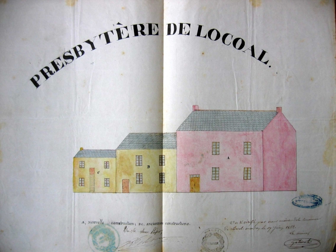 Le presbytère de Locoal semble reconstruit au milieu du 19e siècle à l'emplacement d'un bâtiment plus ancien, probablement du 17e siècle, dont il subsiste le portail d'entrée à l'ouest, les cours encloses de murs, et les dépendances à l'est et au nord remaniées au 18e siècle. Le logis est agrandi dans la seconde moitié du 19e siècle avec l'ajout d'une aile en retour d'équerre au nord-est. Aux archives départementales, le dessin daté 1852 qui figure la nouvelle élévation du presbytère ne correspond pas au bâtiment actuel ; il s'agirait d'un projet qui n'a pas abouti. D'après les archives, des travaux de réparations sont effectués en 1890.