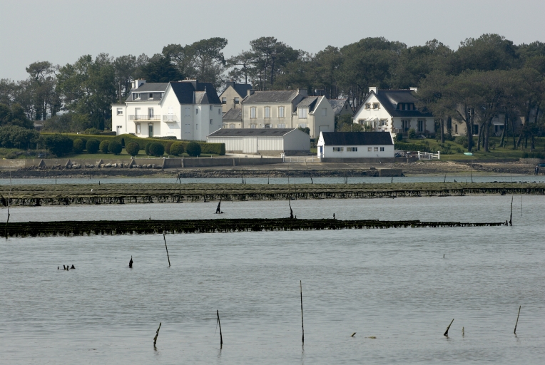 Les chantiers ostreicoles sont pour la plupart des concessions sur le DPM (domaine public maritime) développées à l'ouest de la commune, le long des bras de la rivière d'Etel. Les chantiers se composent de bâtiments d'exploitation pour la préparation (détroquage) et le conditionnement avant expédition et bureau, d'une maison réservée à l'exploitant ou au gardien, et d'infrastructures diverses aménagées sur des terre-pleins : cales, bassins ou parcs à huîtres, aires de stockage. Parmi les chantiers repérés sur la commune, certains sont encore en activité, d'autres sont abandonnés ou reconvertis en résidence.Tous ne sont pas complets : la maison d'ostréiculteur ou de gardien est parfois le seul élémént conservé du chantier ostréicole. Les propriétaires de concessions n'habitaient pas toujours sur place, des gardiens étaient souvent employés pour la surveillance et l'exploitation de leurs parcs. Les maisons de gardien, construites près du rivage dès la fin du 19e siècle, sont de dimension modeste parfois doublées d´un atelier ou d´une remise en appentis (fig. 28). Elles sont à pièce unique ou à deux pièces symétriques (fig. 18 et 33). Les façades sont souvent enduites, quelques unes sont en moellon. Ces maisons ne sont pas systématiquement identifiées comme maisons de gardien faute d'un récollement précis entre archives et bâtiments existants. Les maisons de propriétaires concessionnaires des parcs sont plus grandes, avec un étage carré, parfois situées un peu à l'écart des bâtiments d'exploitation et des parcs à huîtres (fig. 8, 10 et 23). Elles témoignent avec les extensions réalisées dans les années 1930 de la prospérité et de la longévité de l'activité ostréicole. La taille et la forme des bâtiments d'exploitation, remaniés dans les années 1950, confirment également la bonne santé économique de l'ostréiculture à cette époque. Sur les 17 chantiers repérés, 3 sont sélectionnés. - Pointe de Pen Inez, ancien chantier ostréicole sélectionné comprenant : maison d'ostréiculteur 2e quart 20e siècle, terre-plein, cale, bassin, ancien bâtiments d'exploitation, enclos (XA 10, DPM). - Pointe de Roc'h Vihanec, chantier ostréicole sélectionné comprenant : maison d'ostréiculteur, anciens bâtiments d'exploitation, terre-plein, cale, bassin, fin 19e siècle, bâtiment d'exploitation milieu 20e siècle (XA 144 ; DPM). - Pointe de Roc'h Vihanec, ancien chantier ostréicole sélectionné comprenant un bâtiment d'exploitation abritant un logis à l'étage, terre-plein, cale, bassin, fin 19e siècle (XA 178 ; DPM). - Corn er Porh, chantier ostréicole repéré comprenant : maison d'ostréiculteur construite entre 1928 et 1930, bâtiment d'exploitation 2e moitié 20e siècle, terre-plein, bassins (XA 27, 28, DPM). - Corn er Porh, chantier ostréicole repéré comprenant : ancienne maison d'ostréiculteur construite vers 1900, rallongée d'une maison à étage dans les années 1930, ancien bâtiment d'exploitation, 2e moitié 20e siècle (XA 23, DPM). - Pointe de Goulen, Bec Cognel, chantier ostréicole repéré comprenant : maison d'ostréiculteur début 20e siècle rallongée dans le 2e quart du 20e siècle, bâtiment d'exploitation 2e moitié 20e siècle, terre-plein, cale, bassin, digue (XA 192, DPM). - Pointe de Goulen, Bec Cognel, ancien chantier ostréicole repéré comprenant un bâtiment d'exploitation, début 20e siècle (XA 191). - Beg Lannec, ancien chantier ostréicole repéré comprenant : deux maisons d'ostréiculteurs, terre-plein, bassin, cale, fin 19e siècle. - Pointe de Kerdoret, ancien chantier ostréicole repéré comprenant : maison d'ostréiculteur, bâtiment d'exploitation, terre-plein, bassin, digue, cale, 1er quart 20e siècle (ZC 43, DPM). - L'Istrec, ancienne maison d'ostréiculteur repérée, 2e quart 20e siècle (ZB 65). - L'Istrec, ancienne maison d'ostréiculteur repérée, début du 20e siècle, vue générale est (ZB 66). - L'Istrec, ancienne maison d'ostréiculteur repérée, 1er quart 20e siècle (ZB DPM). - Le Roc'h, ancienne maison d'ostréiculteur et atelier associé repérés (?), fin 19e siècle (ZA 80). - Pointe de Pen Inez, ancien chantier ostréicole repéré comprenant : maison d'ostréiculteur, bâtiments d'exploitation en ruines, fin 19e siècle (XA 160a). - Mané Béniguet, ancienne maison d'ostréiculteur repérée, fin 19e siècle (YV 15) - Pointe du Verdon, ancienne maison d'ostréiculteur fin 19e siècle, bâtiment d'exploitation 20e siècle, parcs à huîtres.