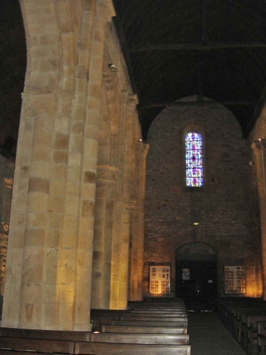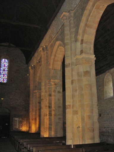 A l´intérieur l´édifice présente une nef à trois vaisseaux et cinq travées de plan barlong. La nef centrale est séparée des bas-côtés, plus étroits, par de hautes arcades à double rouleau brisé. Les piles sont de plan cruciforme, elles sont flanquées sur les quatre faces de demi-colonnes. Du côté de la nef et des collatéraux ces demi-colonnes, engagées sur un dosseret, montent jusqu´à hauteur d´une corniche moulurée horizontale (formant l´abaque des chapiteaux couronnant les supports) qui court sur toute la longueur du mur, au-dessus de l´extrados des arcades brisées.